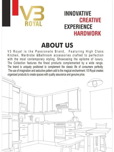 V3ROYAL offers a wide range of premium hardware and fittings for kitchens and wardrobe, including Enotec,Slim box, Pantry, Bottle pull out, magic corner, swing corner, baskets, shutter, profiles, hinges, telescopic channel, quadro, handles, sliding door systems, bed fittings, trouser rack, iron board, shoe rack and more. Our products combine style and functionality to enhance the beauty and functionality of any kitchen or wardrobe space.